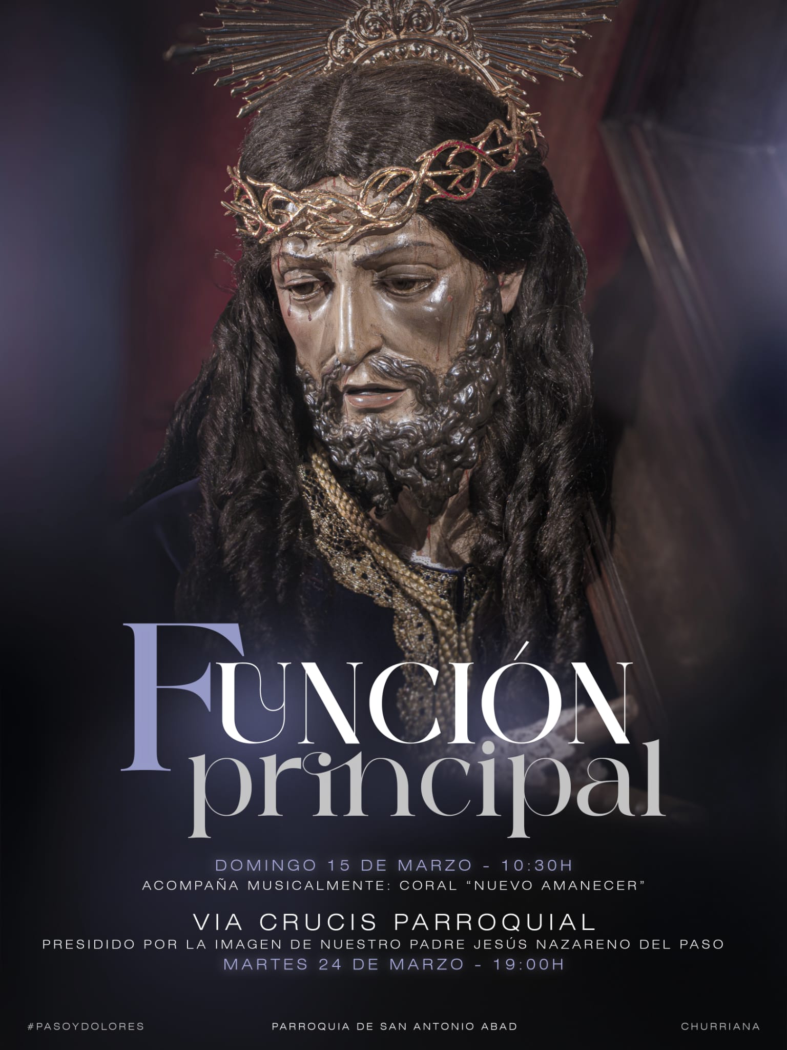 Misa en Honor a Nuestro Padre Jesús Nazareno del Paso + Añadir Google Calendar Exportación + iCal / Outlook Fecha Mar 15 2026 Finalizdo! Hora 10:30 - 23:00 Localización Iglesia San Antonio Abdad Churriana, Malaga Categoría ACTUACIÓN Compartir este evento